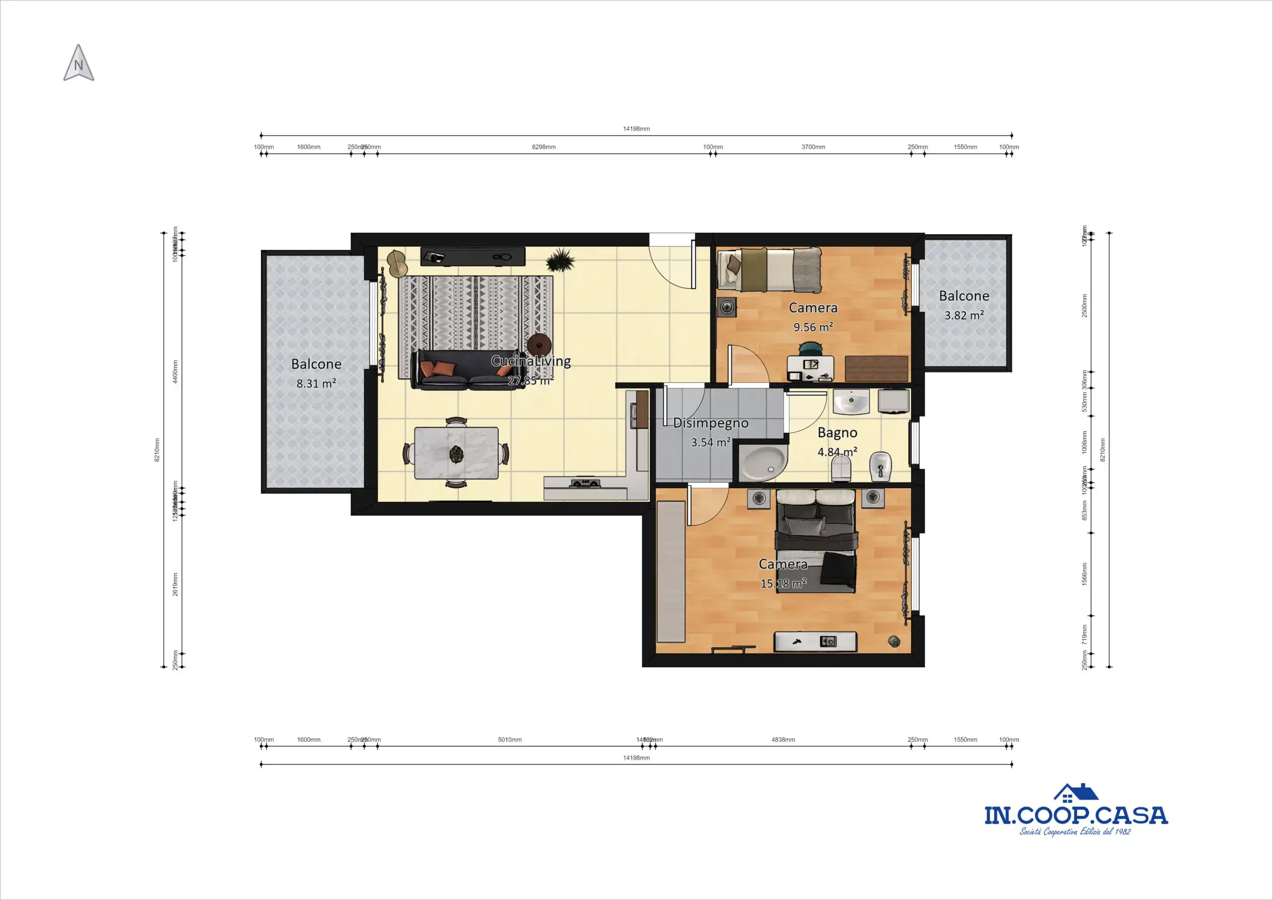 Trilocale di 70 mq composto da Cucina Living, due camere da letto, bagno e balconi (11 mq). Compreso nel canone Box Auto e cantina. Edificio di nuova costruzione in classe energetica A3.